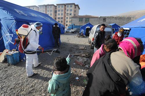 4月17日,一名疾控人员在玉树州体育场受灾群众安置点开展防疫消毒。李紫恒 摄