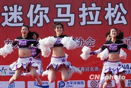 4月17日,拉拉队在舞台上激情舞动,为第24届大连国际马拉松比赛造势。当日,第24届“体育彩票杯”大连国际马拉松赛暨2010年“全日空杯”全国马拉松冠军赛4.2公里的小马拉松赛在大连举行。