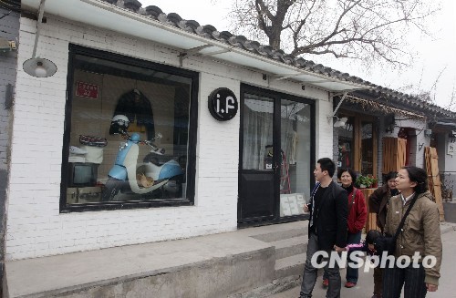 4月17日,北京东城区安定门五道营胡同,游客从开门营业的店铺前经过。中新社发 老罗 摄