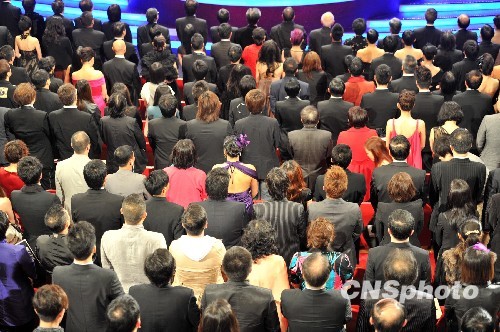 4月18日晚,第29届香港电影金像奖颁奖典礼在香港文化中心大剧院举行。颁奖礼开幕前,全体人员起立为青海玉树地震遇难同胞默哀一分钟。中新社发 郑祚声 摄