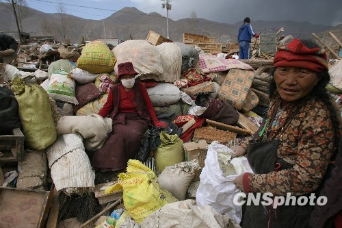 4月18日,玉树结古镇受灾民众挖掘家中被埋的物品。中新社发 苏丹 摄