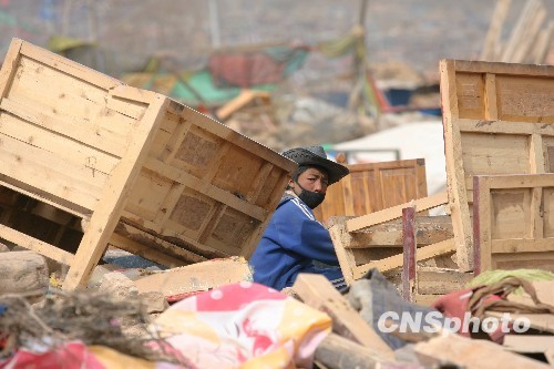 4月18日,玉树结古镇一藏族男孩在挖掘家中被埋的物品。中新社发 苏丹 摄