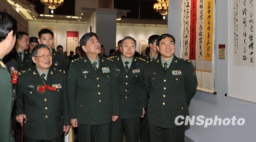 李铎陪同解放军总政治部副主任杜金才(左二)、解放军总政治部宣传部副部长黎国如(右一)参观“李铎师生书画作品展”。中新社发 王保胜 摄