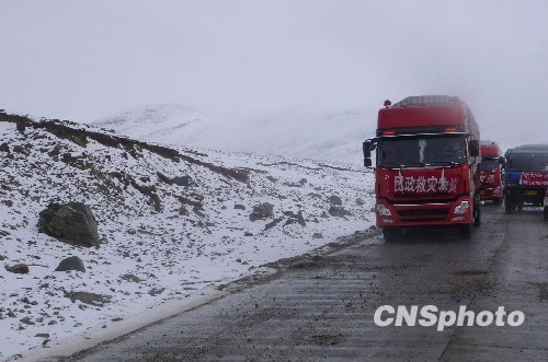 4月19日,青海省南部普降中雪,西宁至震区玉树的生命线白雪皑皑,给源源不断从西宁奔赴震区玉树的抗震救灾车辆增添了巨大困难,但难挡各地各界的爱心。