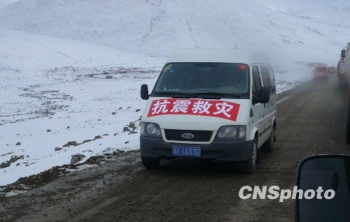 从西宁奔赴震区玉树的抗震救灾车辆在白雪皑皑的高原行驶。中新社发 张晓理 摄