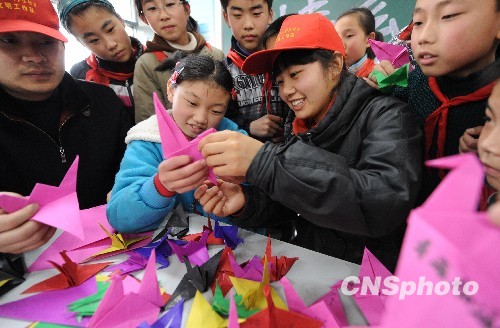 江苏省扬州市广陵区汤汪乡汤汪小学学生为青海玉树灾区儿童折爱心纸鹤。中新社发 孟德龙 摄