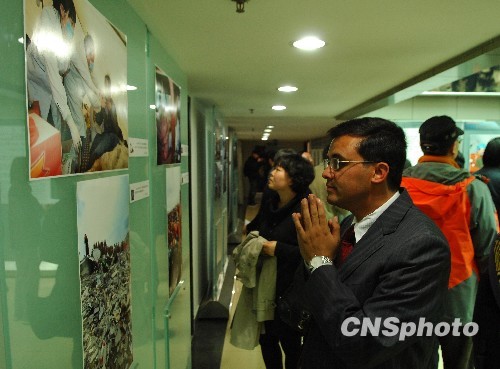 尼泊尔驻华大使馆参赞尼尔马・卡夫利被《2010青海玉树抗震救灾纪实摄影展》中来自玉树地震灾区一线的图片所震撼,双手合十为灾区祈福。中新社发 侯宇 摄
