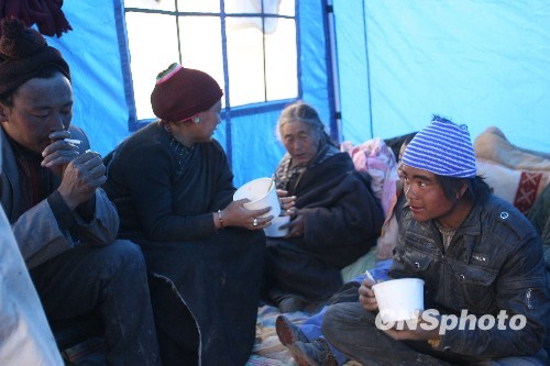 玉树州体育场内搭建的临时帐篷里,尕玛德勒一家正在共进午餐。中新社发 苏丹 摄