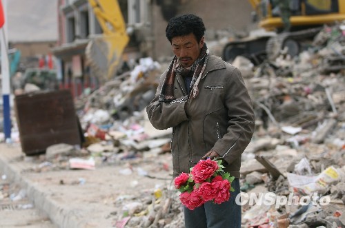 青海省玉树县结古镇一居民从震后废墟中挖出一束花并将其带走。中新社发 苏丹 摄