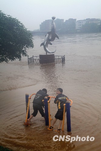 在广西桂林市全州县城滨江路上一批健身设施被上涨的湘江水淹没。中新社发 王滋创 摄