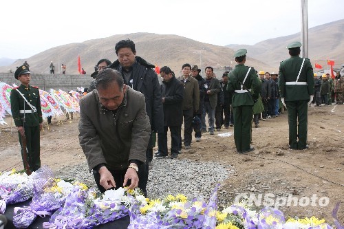 图为青海玉树结古镇参加悼念活动的民众为地震遇难者献花。中新社发 苏丹 摄