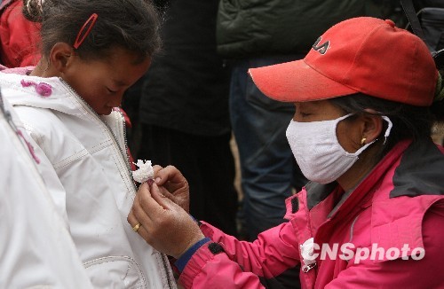 图为青海玉树结古镇参加悼念活动的老师用纸巾做成白花佩戴在小学生胸前。中新社发 苏丹 摄
