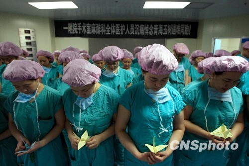4月21日,新疆医科大学第一附属医院住院部手术室举行仪式哀悼玉树地震遇难者,100余位医护人员在手术室内手持千纸鹤为玉树灾区哀悼、祈福。中新社发 刘新 摄