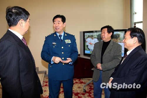 总政治部副主任、友联画院名誉院长刘振起(左二)出席“心系玉树”赈灾笔会,向艺术家们表示感谢。中新社发 王保胜 摄