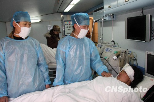 济南军区野战方舱医院的医务人员在青海玉树地震灾区为受伤民众诊治。中新社发 李玉银 摄