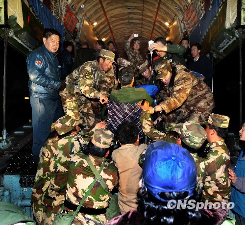 21时52分,最后一名伤员被托举上飞机。中新社发 刘应华 摄