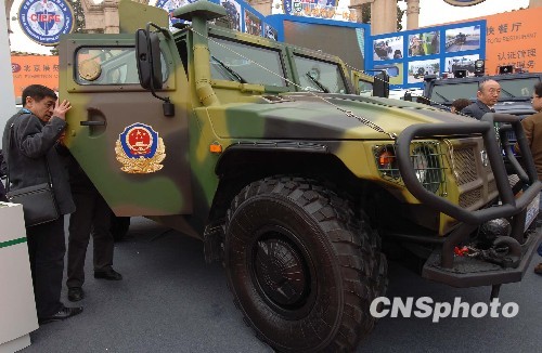 北京燕京汽车厂新生产的燕京卫士装甲车被观众看好。中新社发 邹宪 摄