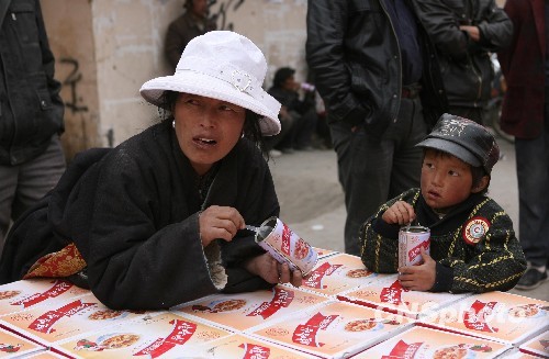玉树一对母子在品尝刚刚领到的免费八宝粥罐头。中新社发 苏丹 摄