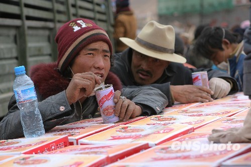 两位玉树居民在领取到免费的八宝粥后立即开盖品尝。中新社发 苏丹 摄