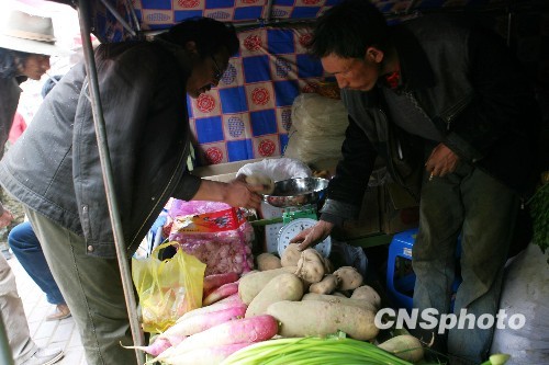 玉树民众在街边的帐篷菜店买菜。震后玉树的商业活动正逐步恢复。中新社发 苏丹 摄