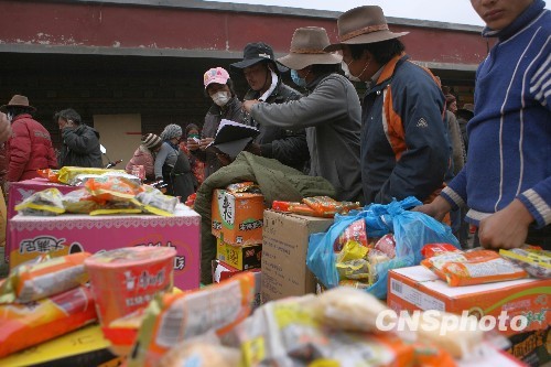 玉树县下拉秀乡受灾家庭领取抗震救灾指挥部提供的方便面、火腿肠、饼干等免费食品。中新社发 苏丹 摄