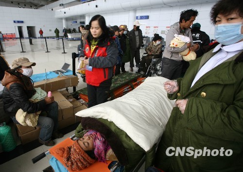 4月22日,参与青海玉树抗震救灾的救援队和部队官兵10多人因高原反应被紧急送往机场转运西宁救治。图为玉树机场一名孕妇等待转运成都救治。中新社发 刘忠俊 摄