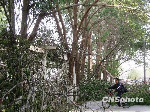 吐鲁番市千米葡萄长廊边的大树被大风毁坏。 中新社发 姜浩 摄