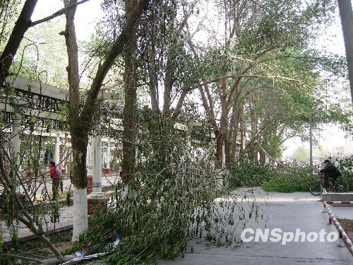 吐鲁番市千米葡萄长廊边的大树被大风毁坏,市民只能绕行。中新社发 姜浩 摄