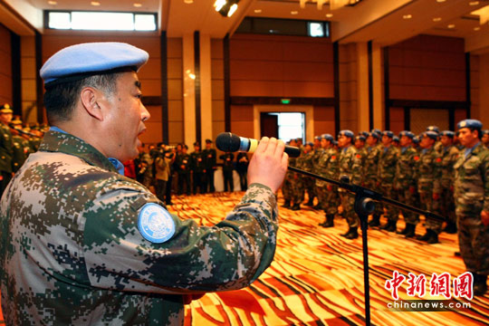中国第十批赴利比里亚维和部队第一梯队273人,4月28日从北京首都机场出征。第十批赴利比里亚维和部队由北京军区某集团军工兵分队、内蒙古军区运输分队和军区总医院医疗分队组成,共558人。工兵分队担负修筑道路、桥梁、掩体,维修房屋、修复机场,实施供水、供电设施建设和保障等任务;运输分队担负人员和物资的输送任务;医疗分队按联合国维和二级医院标准编配,担负伤病员救治、后送和卫生防疫任务。 中新社记者 宋吉河摄