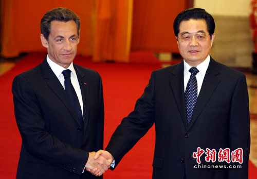 4月28日下午,中国国家主席胡锦涛在北京人民大会堂举行仪式,欢迎法国总统萨科奇访华。中新社发 任晨鸣 摄