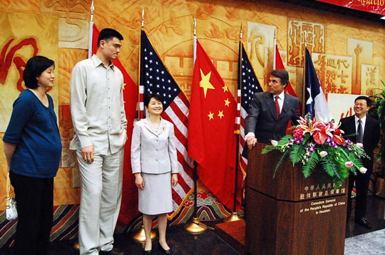 据美国华文媒体报道,中国驻休斯顿总领事高燕平与美国德克萨斯州州长里克·佩里于当地时间4月27日下午5时在总领馆会议大厅举办“庆祝上海世博会和中国-得州友好关系”招待会。担任上海世博会形象大使的中国著名篮球明星姚明和他的妻子叶莉以及当地华人侨领及学界代表200余人应邀出席招待会。