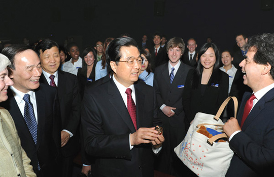 4月29日,前来出席上海世博会开幕式等活动的中共中央总书记、国家主席、中央军委主席胡锦涛参观了上海世博园。这是胡锦涛在美国馆参观。饶爱民摄