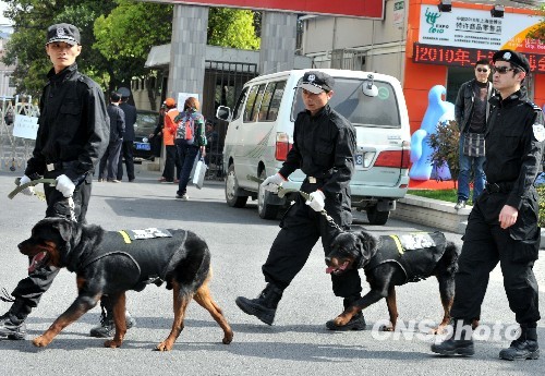 4月30日上午,上海警察携警犬在世博园周围巡逻。本届世博会即将于当晚开幕。中新社发 贾国荣 摄
