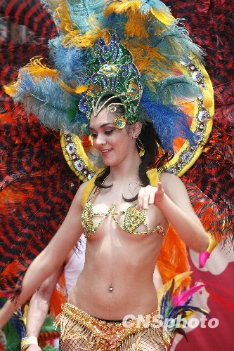 5月1日,2010中国昆明国际文化旅游节昆明狂欢节开幕。来自巴西的桑巴舞团精彩的表演,受到市民的欢迎。图为5月1日,盛装打扮的桑巴舞者。中新社发 刘冉阳 摄