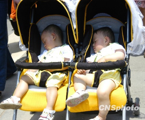 图为一对可爱的小双胞在巡游中睡觉。中新社发 田洪 摄