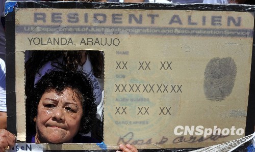 五一劳动节当天,洛杉矶爆发近年来最大规模的移民大游行,抗议亚利桑那州新近通过美国最严厉的反非法移民法案,抗议者同时指责奥巴马总统没有兑现竞选承诺,至今没有推动移民改革。据主办方估计,当天至少有5万人参加了游行。中新社发 张炜 摄