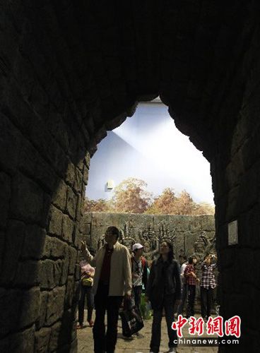 5月1日,观众在世博会柬埔寨馆里参观仿真的大吴哥南门楼。中新社发 苏丹 摄