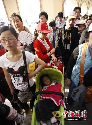 5月1日,上海世博园区正式开门迎宾,在伊朗馆门前,一位母亲推着熟睡的孩子等待入馆参观。中新社发 盛佳鹏 摄