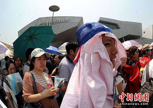 5月2日,上海世博园开园第二天迎来客流高峰,因当地气温大幅上升,游园的民众防晒各有其招。中新社发 廖攀 摄