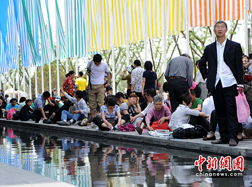 5月2日,上海世博园开园第二天迎来客流高峰,许多观众自备食品,在露天阴凉处享用午餐。中新社发 廖攀 摄
