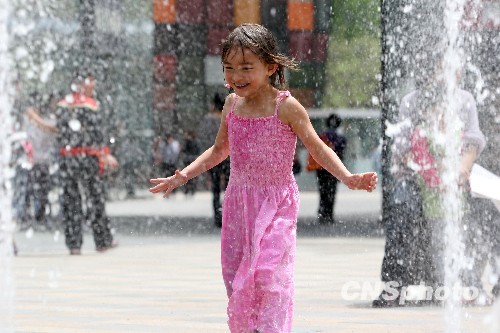 孩子在喷泉水池中尽情嬉戏。中新社发 鲁谷 摄