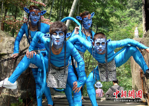 美国科幻大片《阿凡达》中的“纳美人”成为湖南张家界今年“五一”小长假的最新亮点,受到中外游客的追捧。尤其是小朋友和中青年游客,对这四名“纳美人”不仅惊叫连连,还拼命扯着要一起合影,致使其中一名“纳美人”由铁丝包缠着海绵制作而成的尾巴被游客扯断。