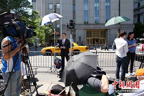 5月4日,有大批媒体聚集在位于纽约曼哈顿的联邦法庭门前。中新社发 魏晞 摄
