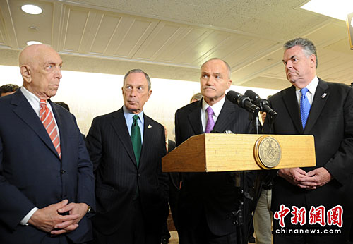 图为布隆伯格(左二)与纽约警察局长凯利(左三)、参议员劳滕伯格(左一)、众议员彼得·金(左四)在出席完参议院国土安全与政府事务委员会有关枪支法案的听证会后共同召开记者会。中新社发 吴庆才 摄