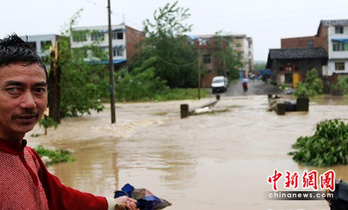 5月6日,重庆垫江县城边一座小桥被猛涨的河水淹没,两村民无奈地等待大水退去才能过桥回家。中新社发 郭晋嘉 摄