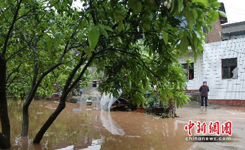 5月6日凌晨,受强对流天气影响,重庆市垫江县遭遇强烈的雷电大风和强降雨袭击,目前已致19人死亡,136人受伤。图为垫江县城边的一户农户已被猛涨的洪水阻断出行道路,老人为出行烦恼不已。中新社发 郭晋嘉 摄