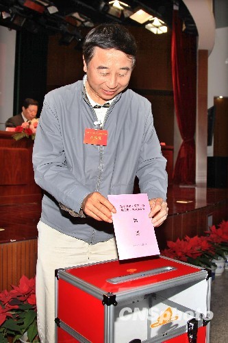 著名相声演员冯巩为文联即将增添新的领导力量而高兴地投票。中新社发 王保胜 摄