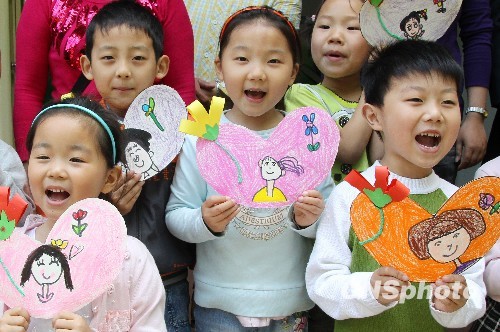 5月7日,几名苏州市彩香幼儿园的小朋友开心展示画给妈妈的蜡笔画。为迎接“母亲节”的到来,该幼儿园百余名大班孩子在老师指导下,各展绘画才艺,用蜡笔描绘出“我心中的妈妈”形象,并张贴在园内几块“母亲节快乐”专题板报上,以表达对母亲的崇敬与感恩。 中新社发 王建中 摄