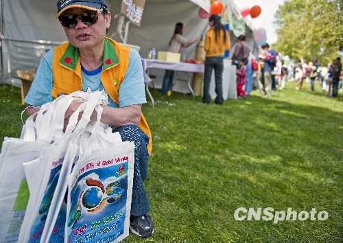 当地时间5月8日,旧金山华人华侨参加纪念母亲节游园会。一位环保人士派发免费环保袋,呼吁素食环保,拯救人类赖以生存的地球。中新社发 陈钢 摄
