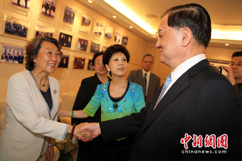 5月11日,中国国民党荣誉主席连战在台北会见“中山·黄埔·两岸情”论坛主要代表。图为连战与黄埔军校政治部主任(早期)周恩来侄女、黄埔4期生周恩寿之女周秉德握手。中新社发 董会峰 摄